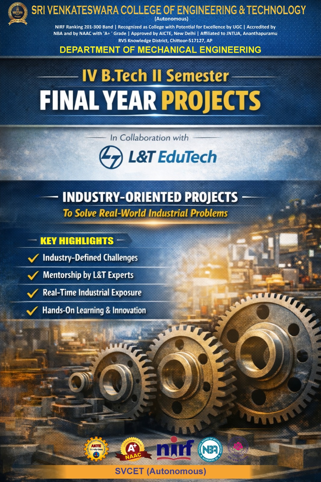 The Department of Mechanical Engineering came into existence in 1998, since the college’s inception, offering B.Tech. in Mechanical Engineering, with an intake of 60, followed by an increase to 240, and currently with 60 intake. Till now Twenty-one batches have passed out. The department has over 11 academic laboratories equipped with some of the state-of-the-art scientific instruments and machineries. The department established 2 skill development laboratories in association with APSSDC – Dassault Systems (3D experience center) APSSDC – ARC (Applied Robotics Control).